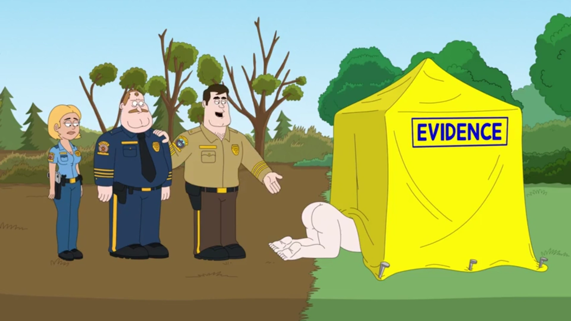 They go to investigate the crime but the dead corpse is actually lying down on the borderline between Paradise and Diamond City. Chiefs Crawford and Hancock argue over whose jurisdiction the body is in and they finally settle on dividing the body between themselves but Paradise gets the short end of the stick because the top half of the victim lies in Diamond City, giving them face, fingerprints, and dental records and the bottom half is in Paradise, meaning that all they have is the victim's ass.