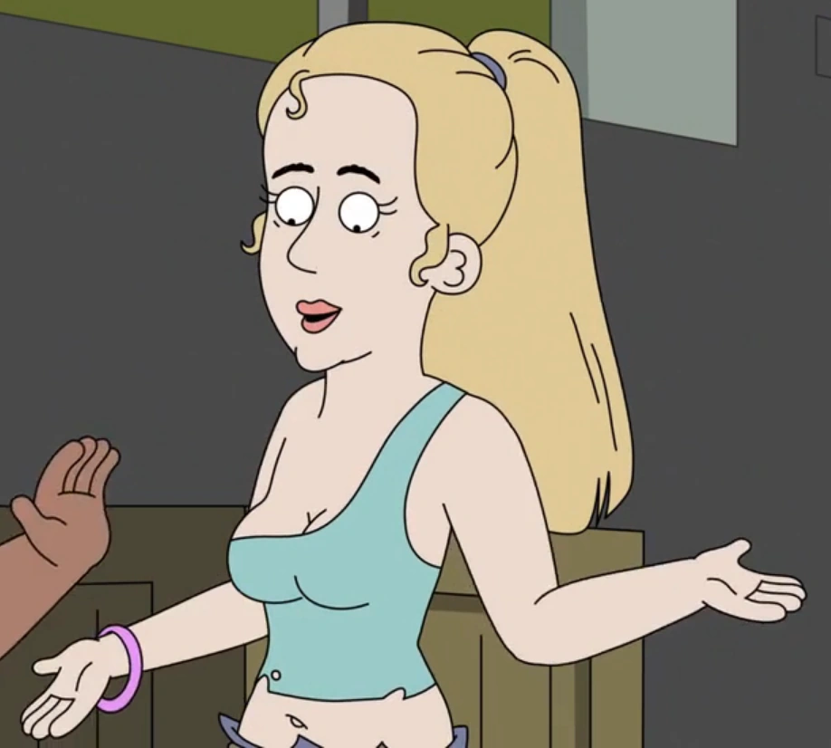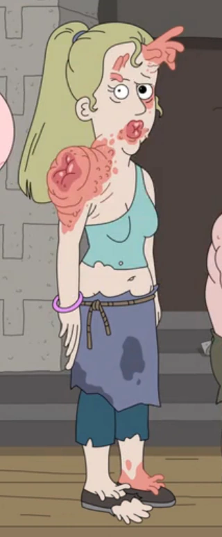 Asshole Shoulder is a Caucasian young adult female with blonde hair worn in a ponytail. She has been genetically mutated so that now she has a bunch of pink fingers and developing hands all over her face and feet. She has an anus for a mouth and a gigantic asshole growing off of her shoulder, which is where she gets her name from. She wears a cyan tube top, a navy blue skirt, and black slip-on shoes.