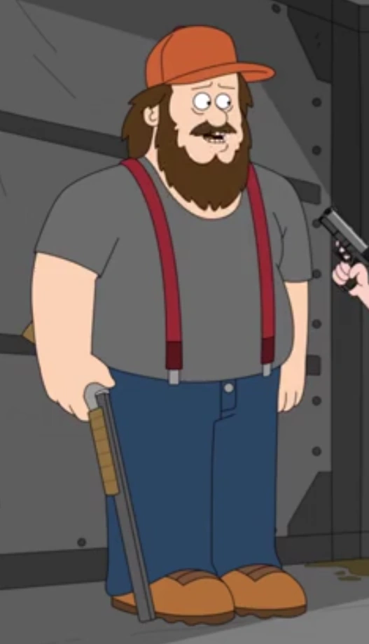 Big Jim is a large-framed, broad-shouldered, Caucasian adult man with a big scraggly lumberjack beard of dark brunette hair. He wears an orange baseball cap, a gray shirt, blue pants hoisted by red suspenders, and orange mudboots with brown bottoms.