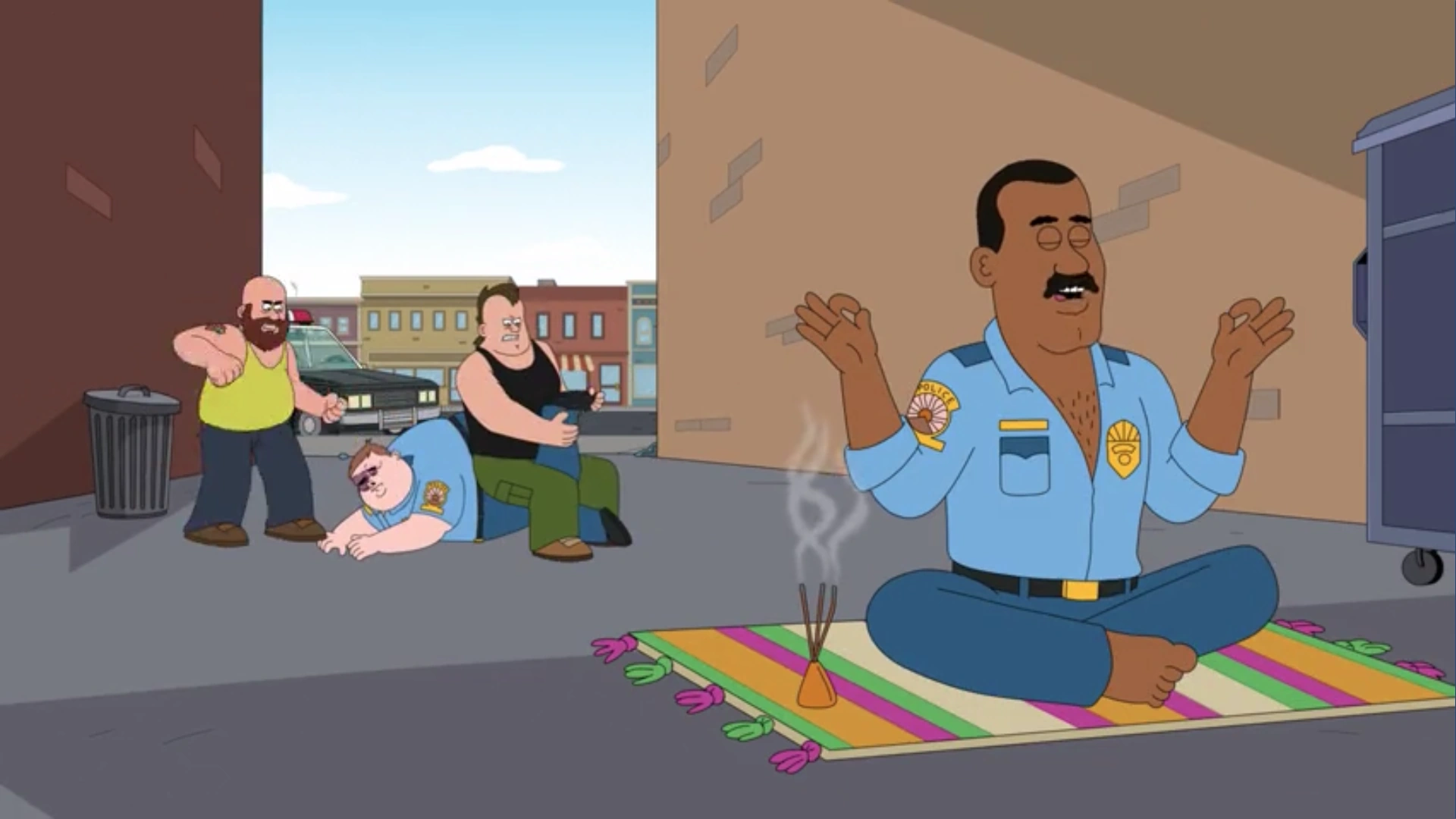 The quality of Gerald's performance as a police officer had sharply declined since then, as now he was too afraid to fight any actual crimes and his from work either by lounging around in his car, goofing off with friends, or most prominently, doing things like meditating or playing his piccolo. Whenever his incompetence was brought to attention, Gerald would just use his PTSD as an excuse.