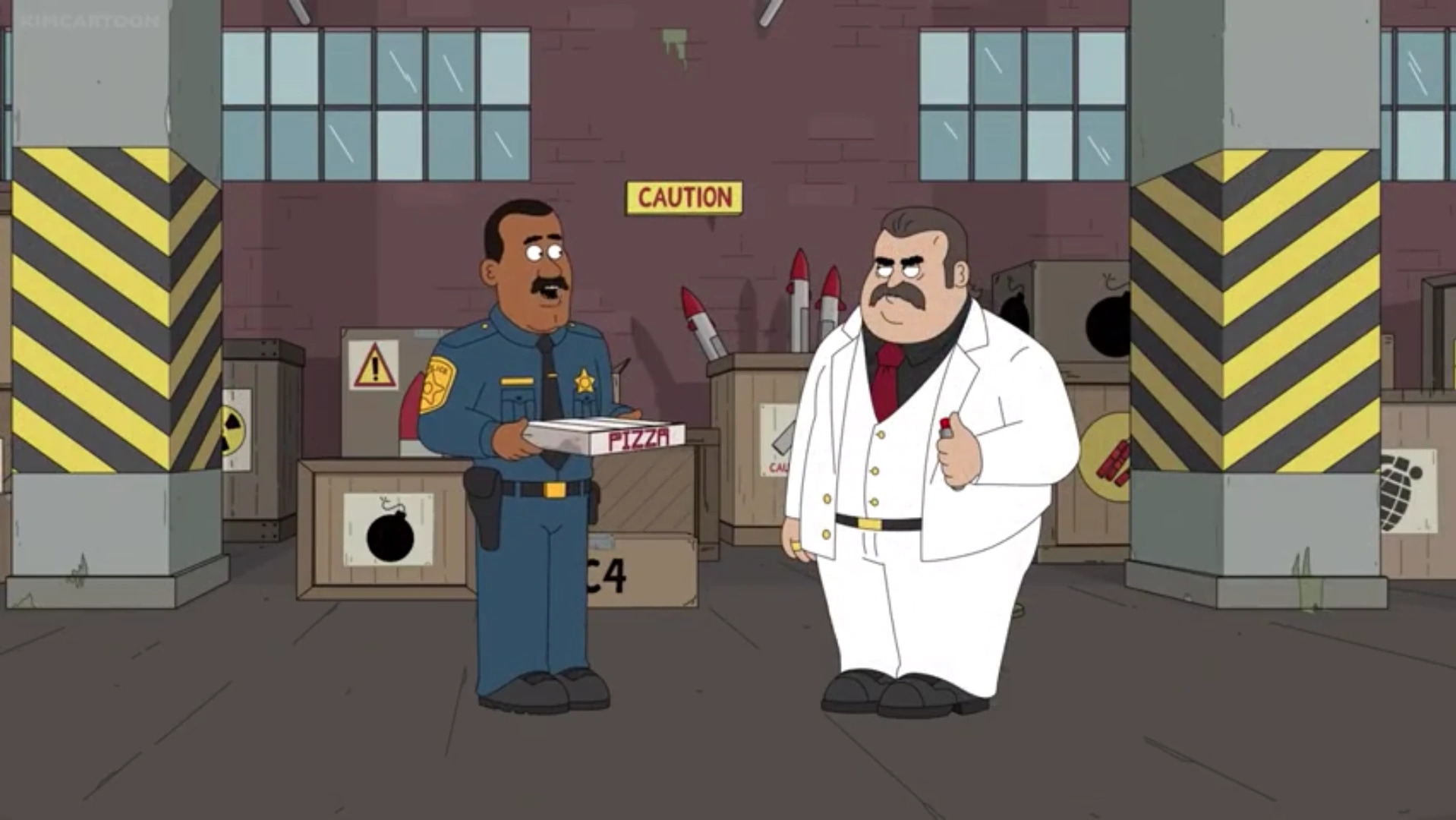 20 minutes later, Fitz gathered together everything The Kingpin asked for. He entered the Bomb Factory with the pizza but The Kingpin was unsatisfied with what he got. Instead of getting the deep dish he asked for, all he got was a stack of three Hot-N-Readies from Little Caesar's, which Fitz shook up in the box, in hopes that it would be passable. The Kingpin was unimpressed and pressed the button, blowing the Bomb Factory, and everyone in it, to shrapnel. Everybody died, except for Fitz, who was protected by the extremely hard and inedible crust of the pizza.