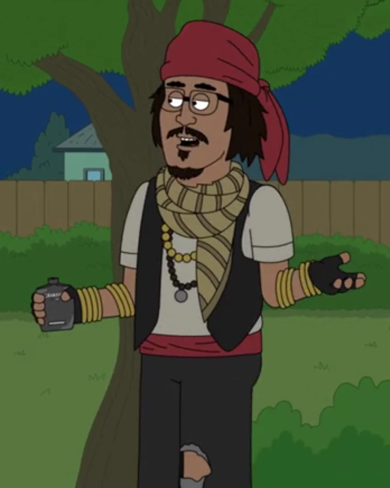 Johnny Depp is an adult Caucasian male with darkened skin that makes him look more ethnic than he really is. He has long, scraggly raven hair, two beards, and one mustache. He wears a red bandana, a white shirt, a tan and brown striped scarf, a black vest, a red belt, gold bracelets, black gloves, a golden pearl necklace, a black pearl necklace with a silver tag, black ripped up pants, white socks, and brown shoes. He is notable for looking very similar to an Indo-Aryan vagabond.