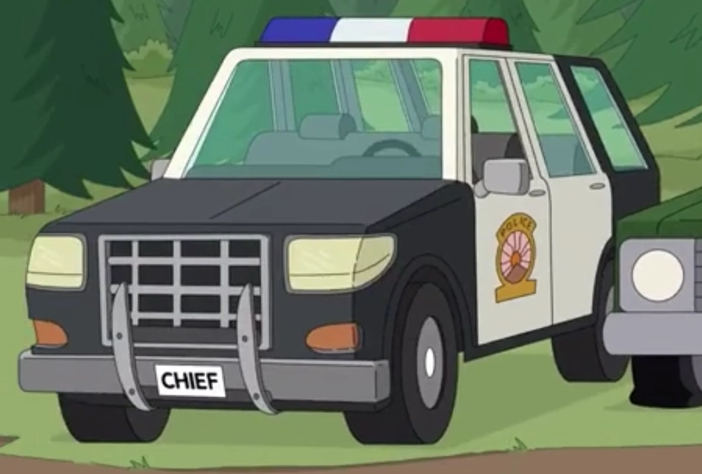 - The squad car's licence plate reads "CHIEF", signifying that it's main driver is Chief Randall Crawford.